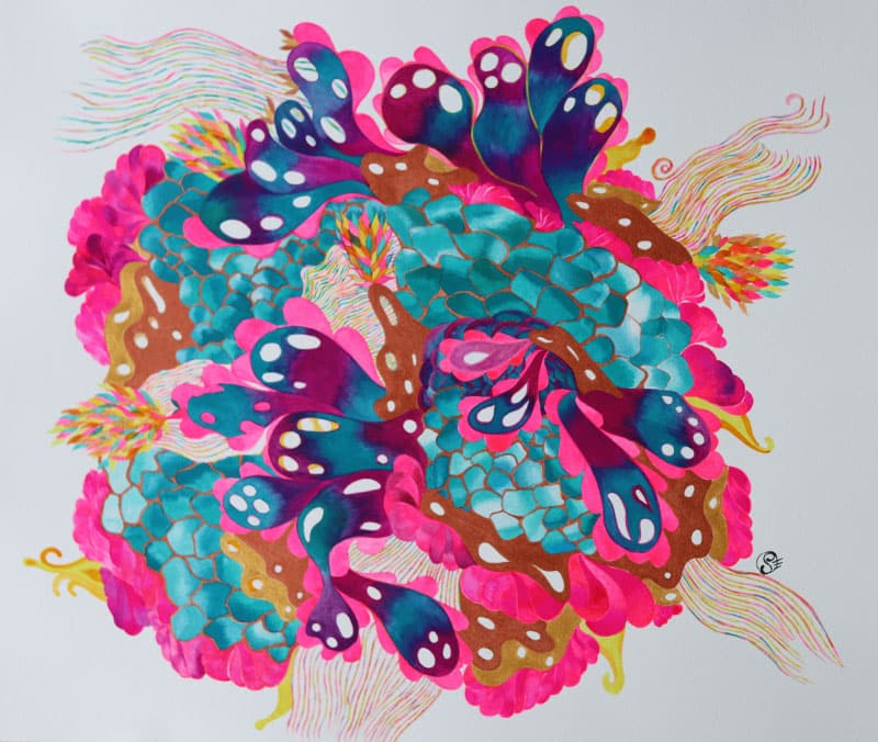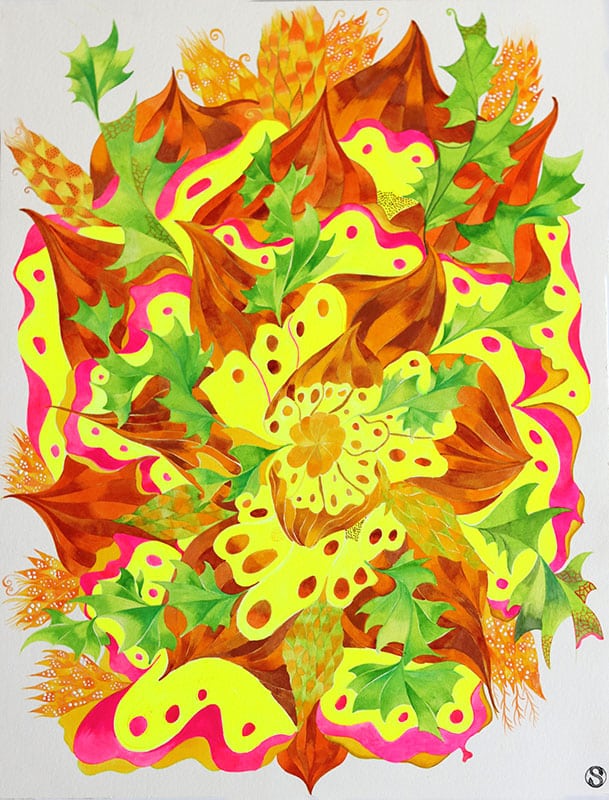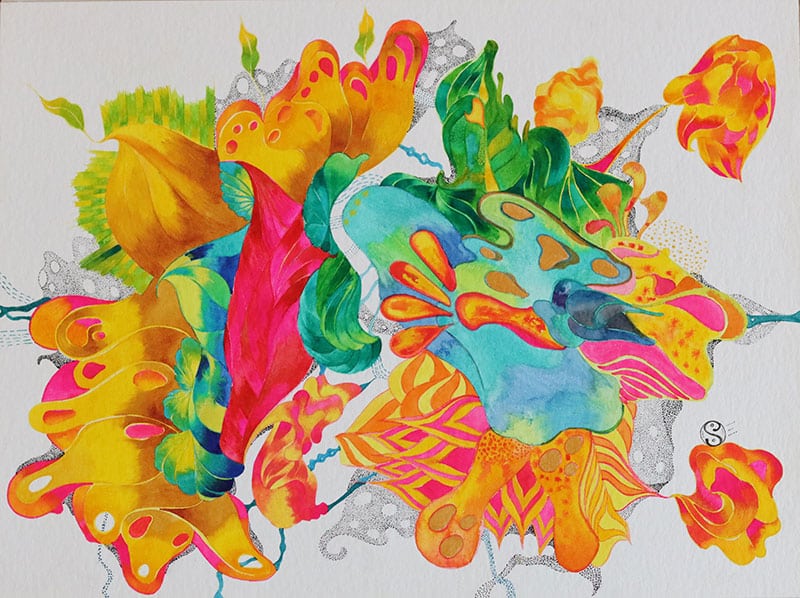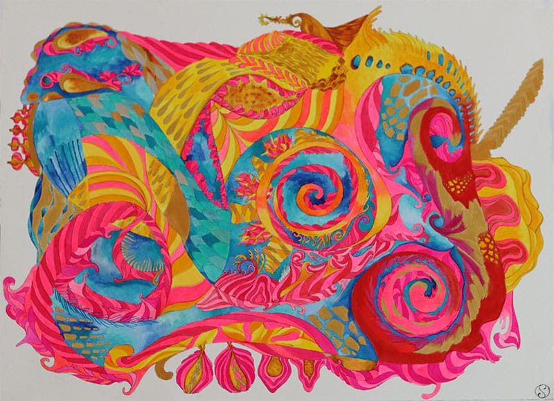 Je présente ici des oeuvres uniques. Elles sont entièrement imaginées et réalisées à la main. Ma technique principale est la peinture avec l’acrylique, la gouache, l’encre, l’aquarelle… . Dans un premier temps j’esquisse le dessin au crayon puis c’est la peinture qui révèle la forme, qui donne vie au tableau. J’utilise d’autres médiums comme le collage, le papier, le textile… Ma peinture est intuitive, musicale, énergétique, je me laisse traverser par un ressenti, une inspiration, une intuition, la musique, un rêve, une visualisation, le hasard, la nature…, pour le choix des couleurs, des motifs.